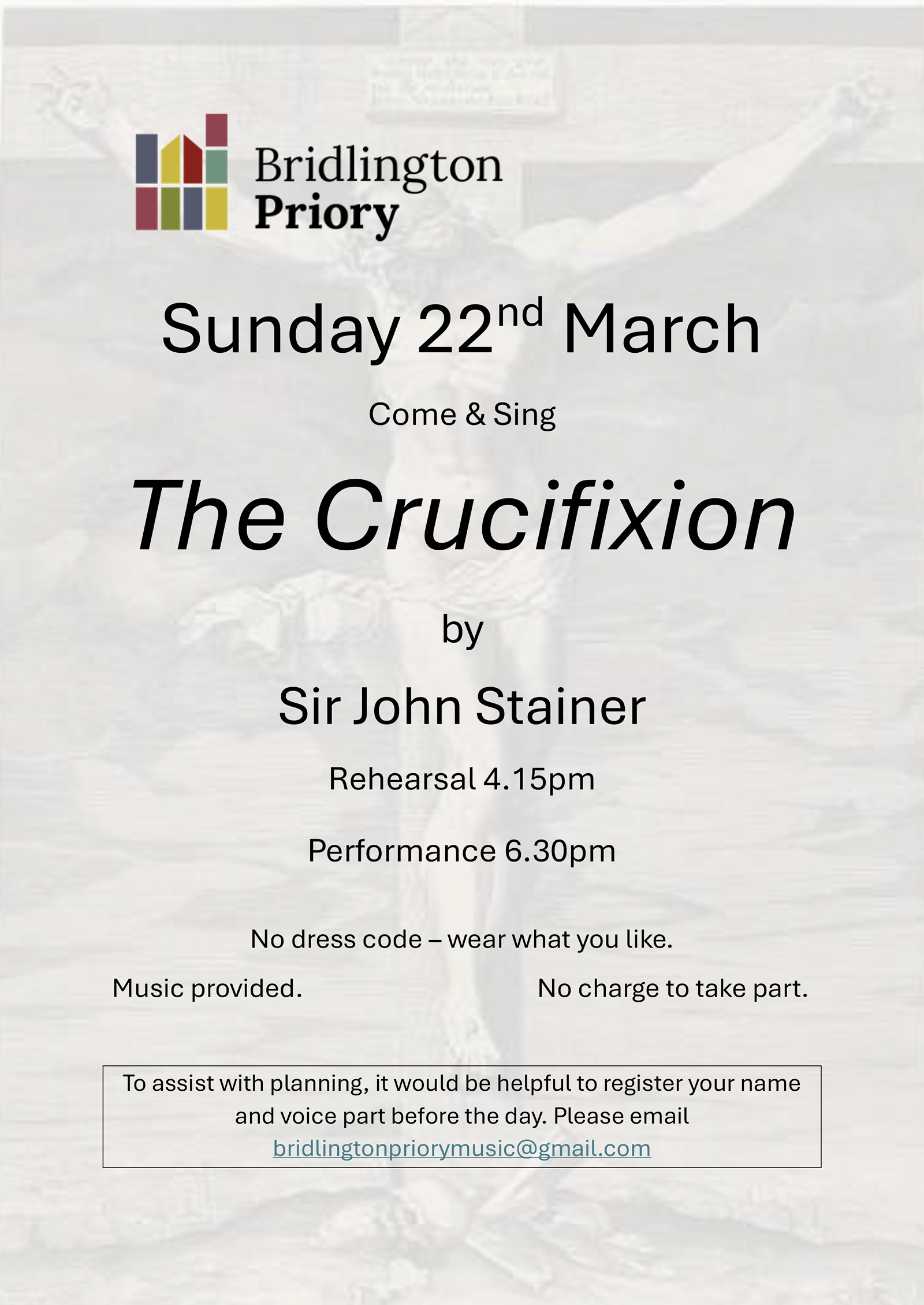 To assist with planning, it would be helpful to register your name and voice part before the day. Please email bridlingtonpriorymusic@gmail.com